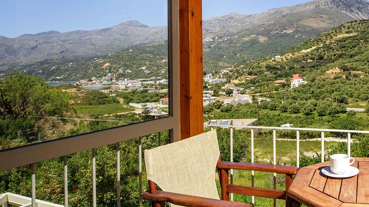 Α private small bedroom balcony with PANORAMIC view to the sea and the mountains.