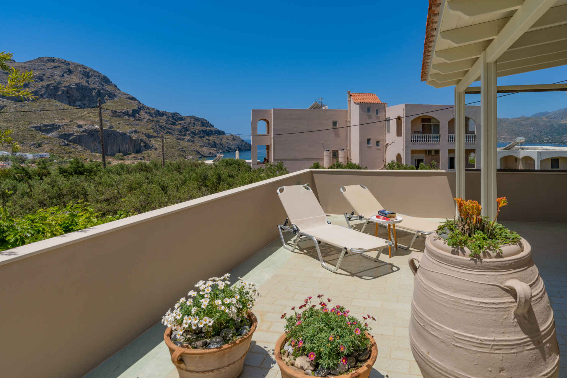 Α second very big balcony (40 sq.m.), decorated with traditional wooden tile roof and view to the mountains and the sea. This huge balcony is in common use for the customers of the next door studio No10.