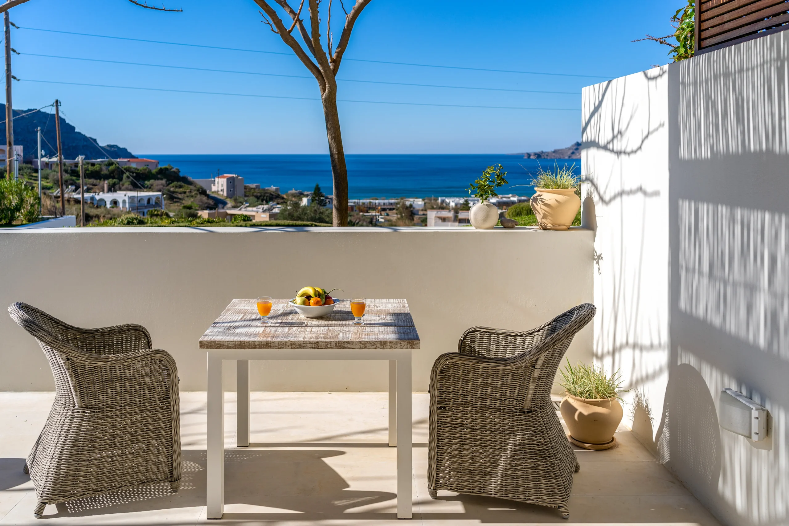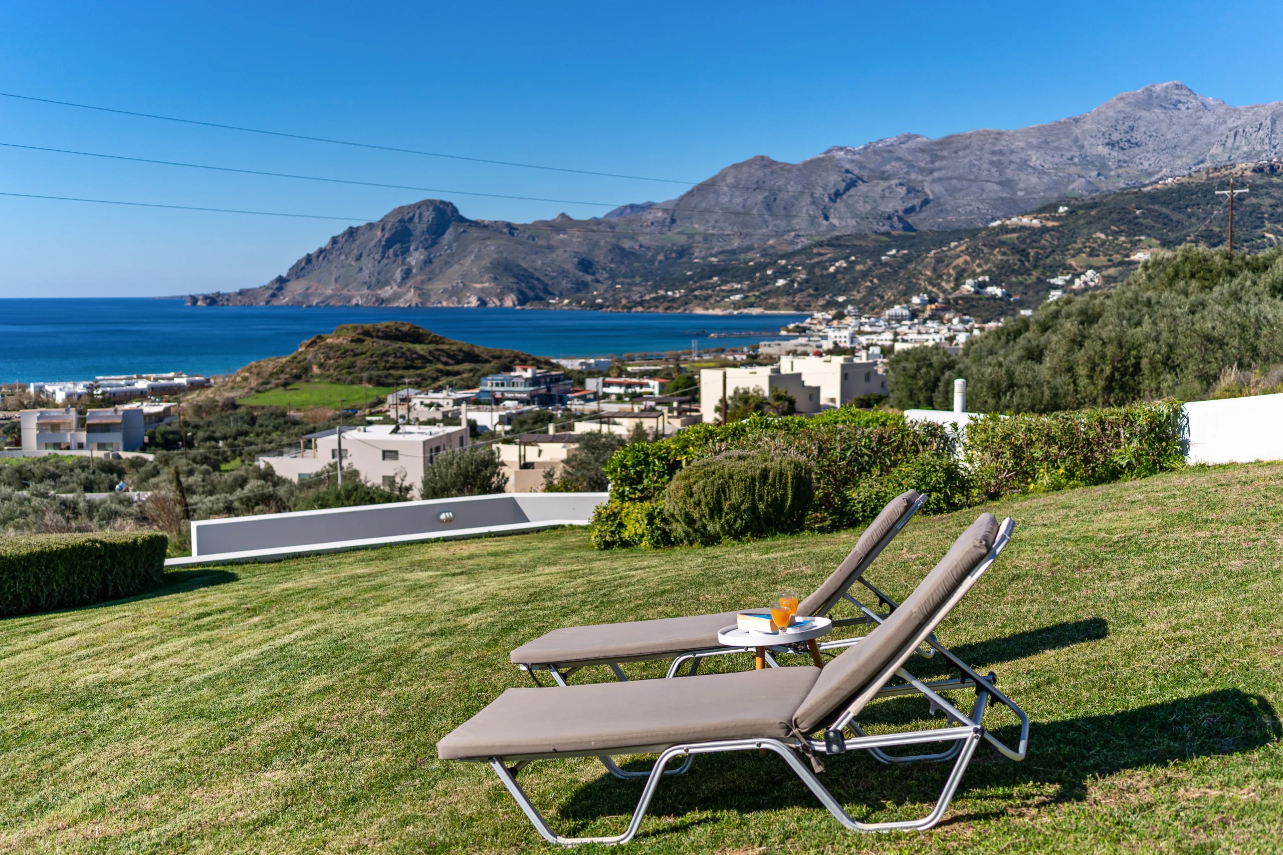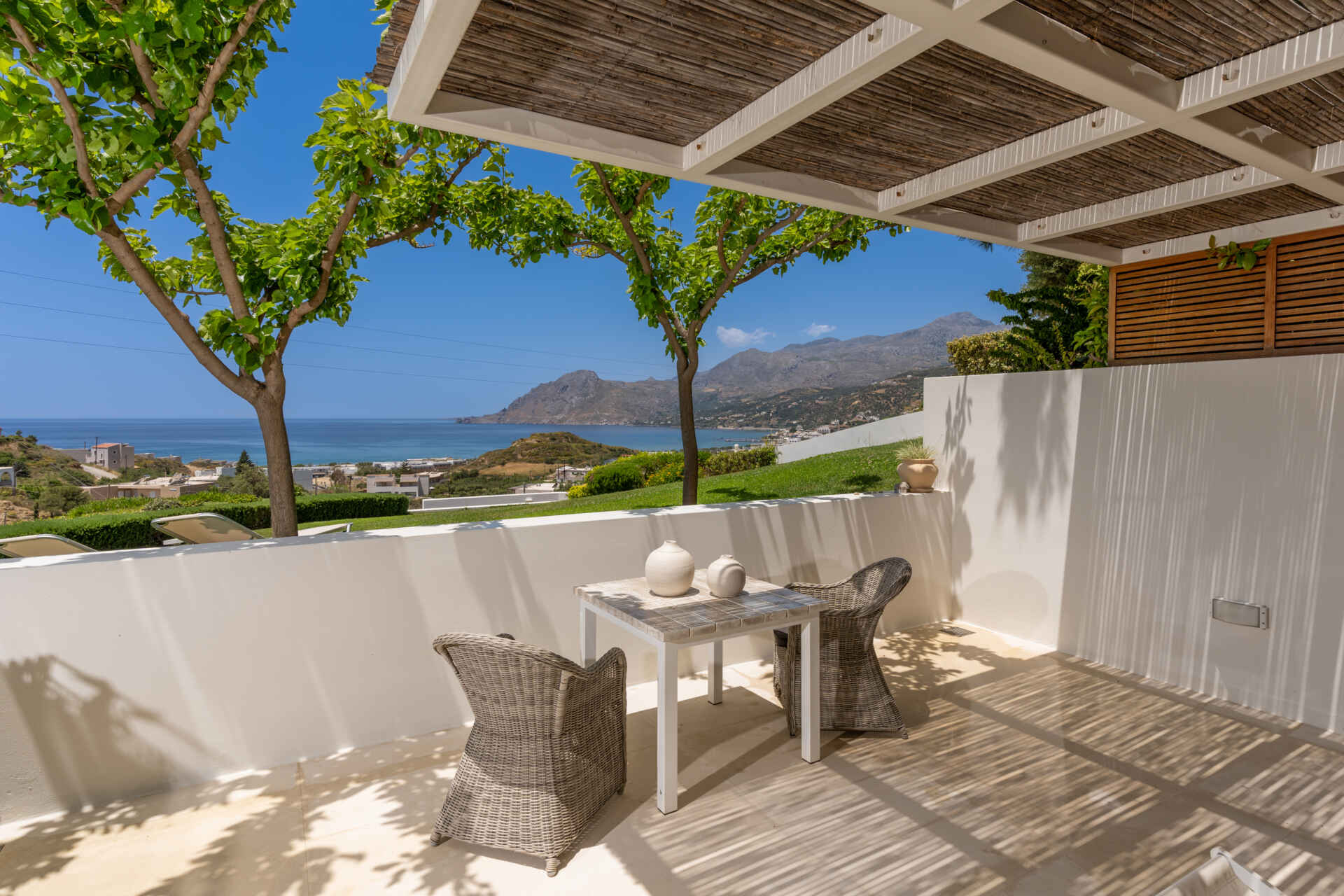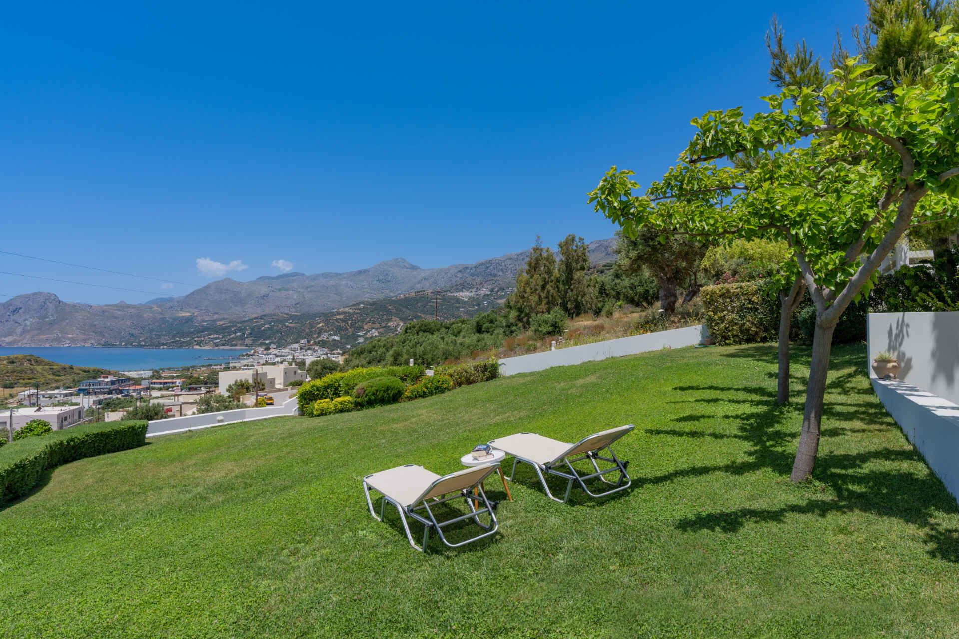 One main balcony outside the sitting room covered with wooden pergola viewing the green garden and the Plakias Beach.