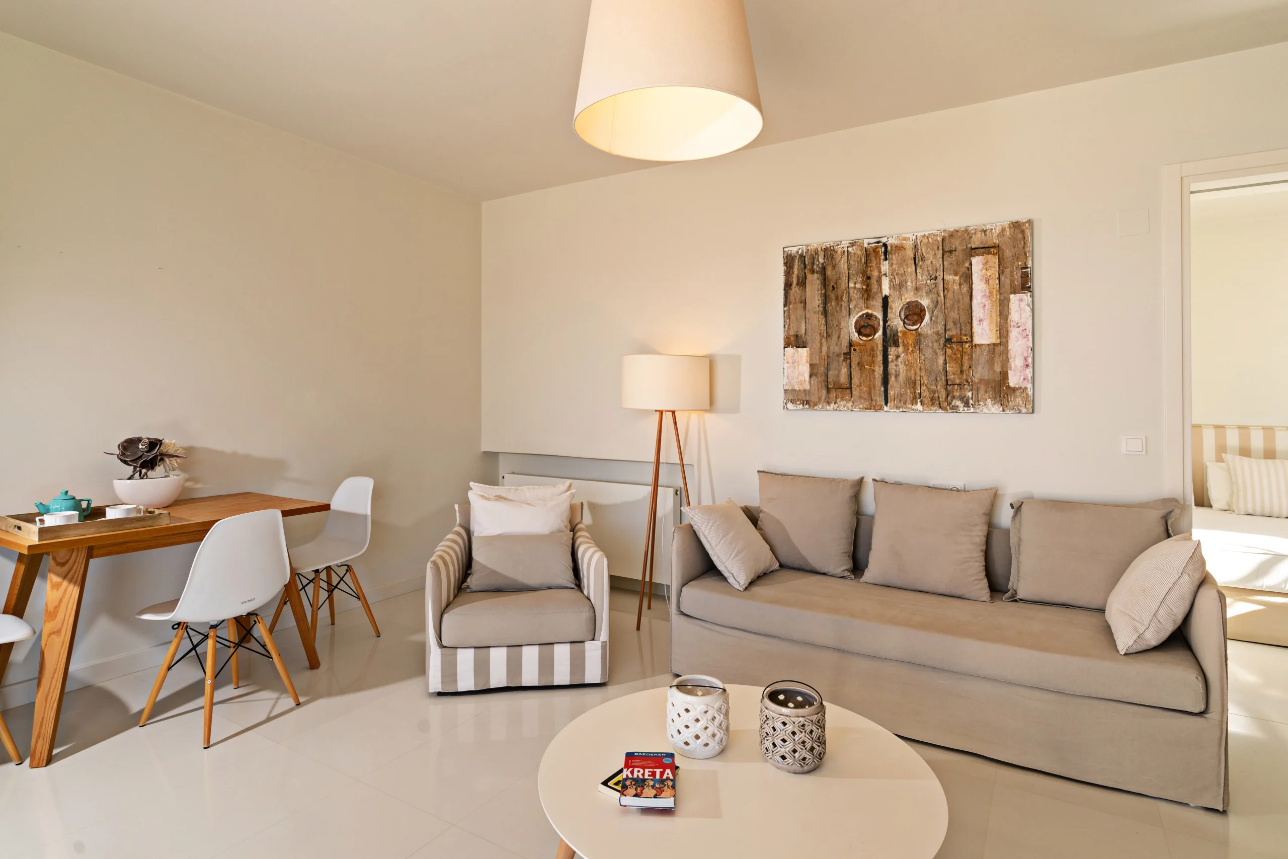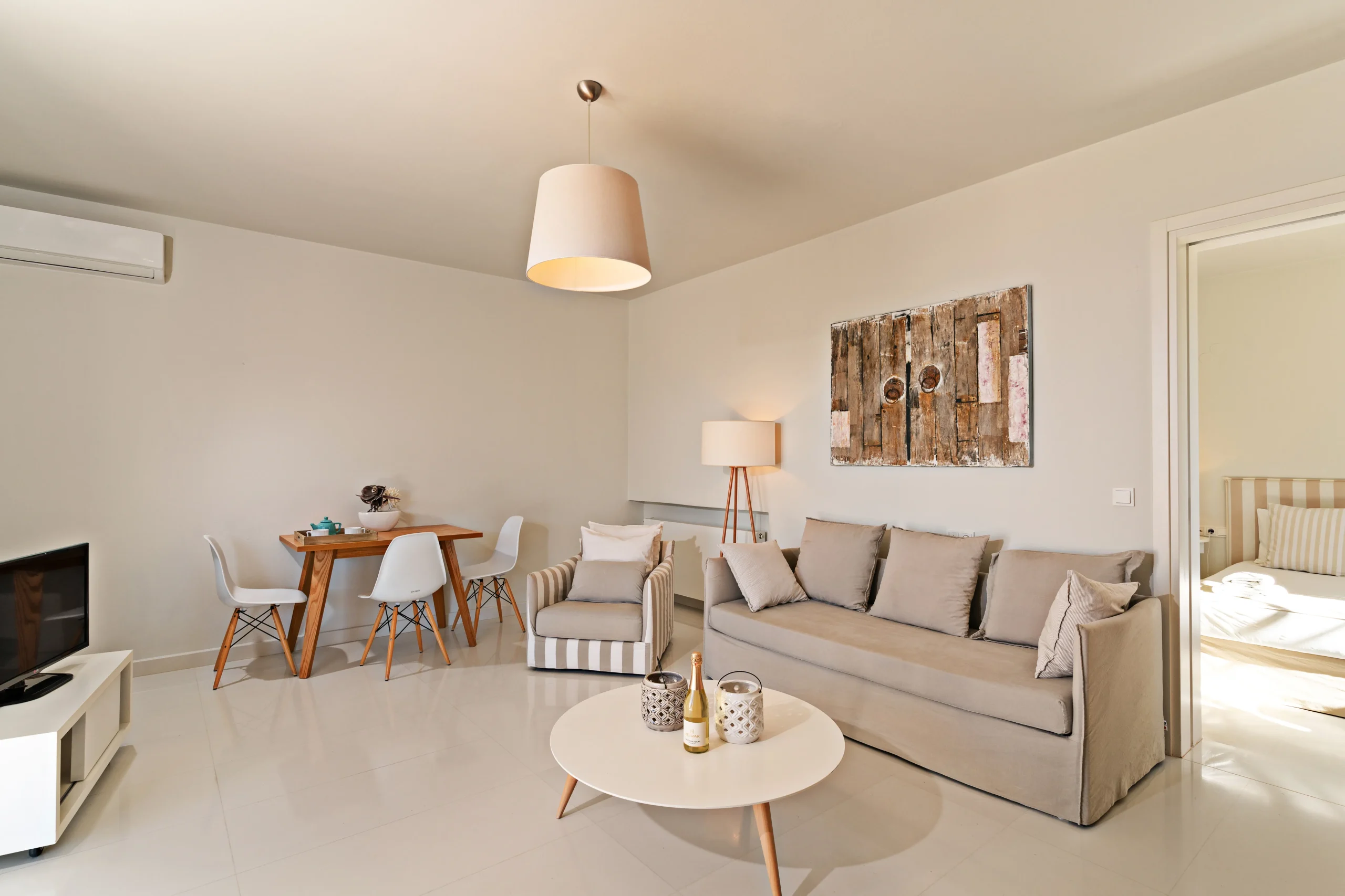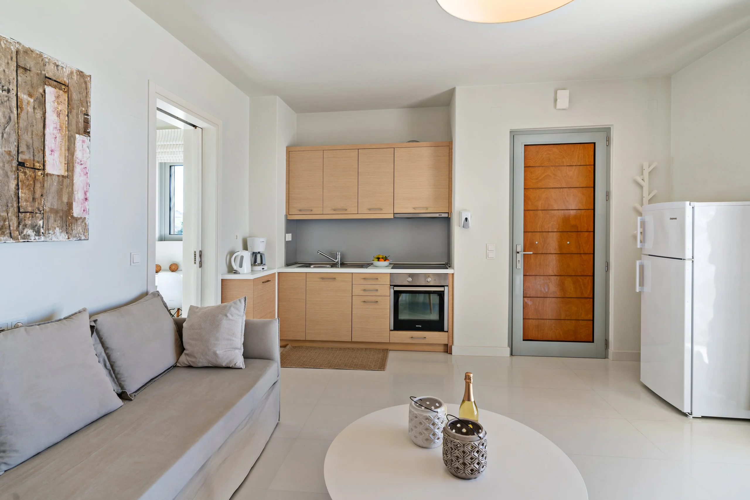 A second air-conditioned fully equipped sitting/kitchen room, furnished with table, chairs, sideboards, cooking top, refrigerator, kitchen sink, coffee maker, water boiler and all the necessary facilities of cooking. This room is also used as a second bedroom for families of 3-4 persons (the sofa is converted into 2 single beds, who can accommodate up to 2 children).