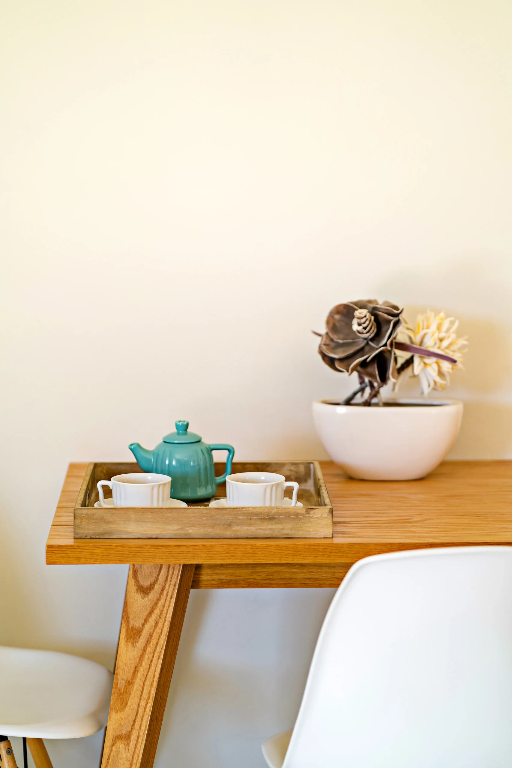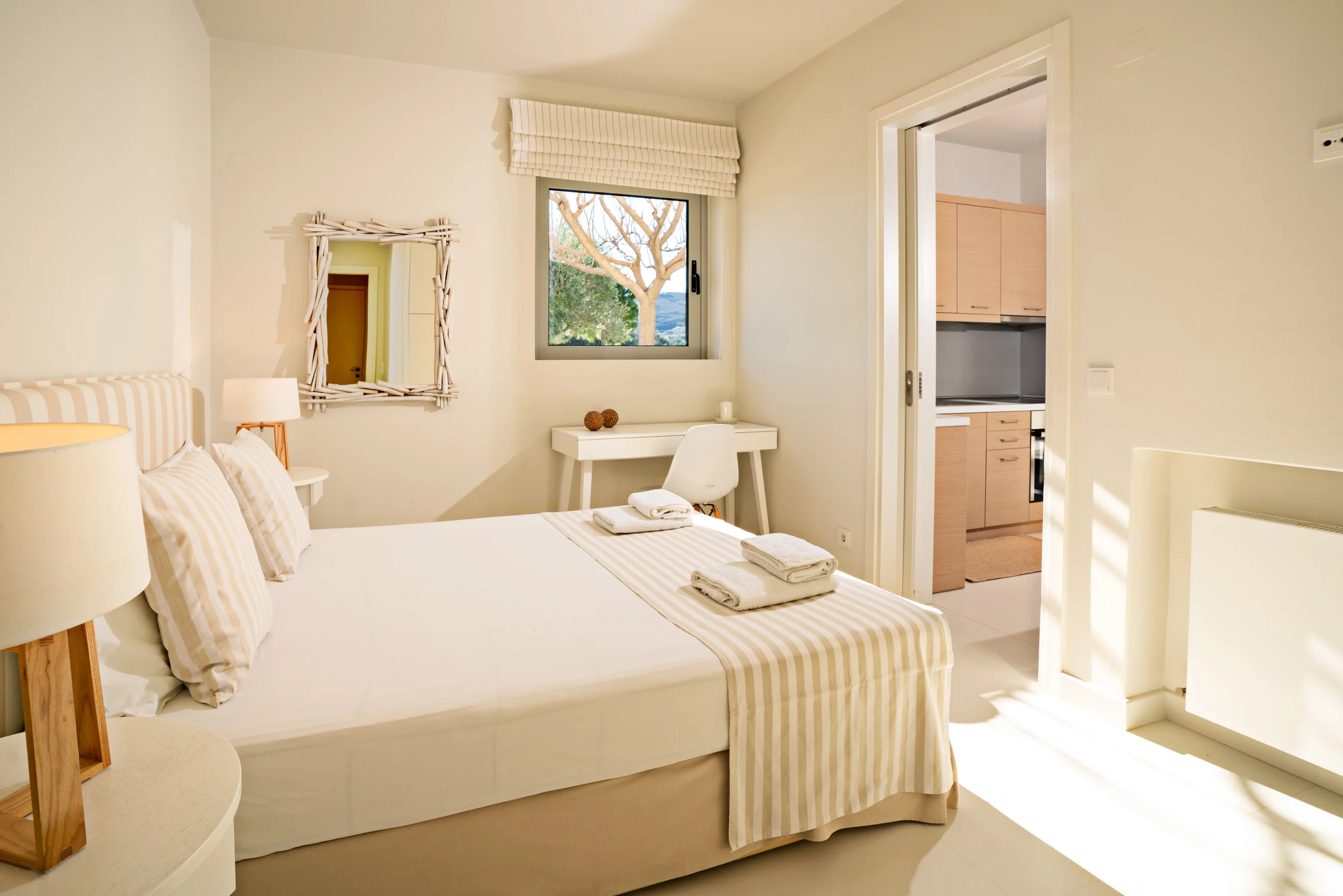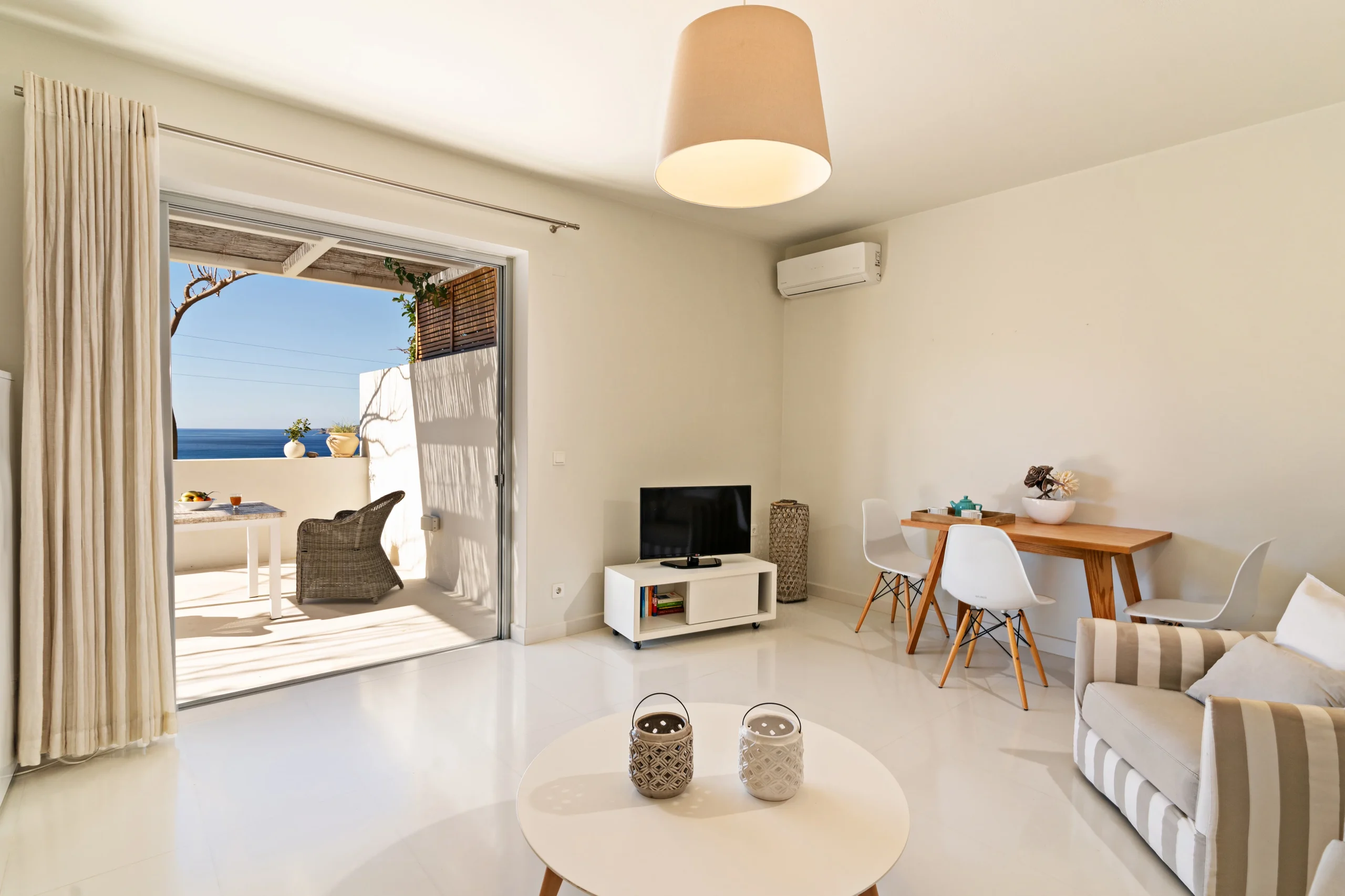 A second air-conditioned fully equipped sitting/kitchen room, furnished with table, chairs, sideboards, cooking top, refrigerator, kitchen sink, coffee maker, water boiler and all the necessary facilities of cooking. This room is also used as a second bedroom for families of 3-4 persons (the sofa is converted into 2 single beds, who can accommodate up to 2 children).